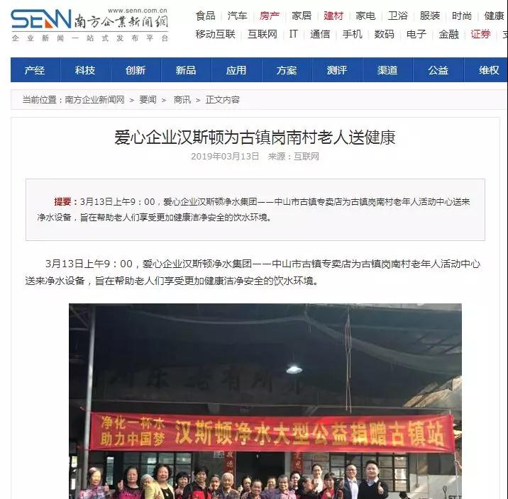 2019年3月,漢斯頓集團(tuán)攜手廣東省中山市古鎮(zhèn)鎮(zhèn)崗南村村委,在老年人活動(dòng)中心開展“凈化一杯水 助力中國(guó)夢(mèng)”活動(dòng),為老人們送來暖心又健康的凈水產(chǎn)品及其他慰問品,祝愿他們可以享受健康的飲水生活。