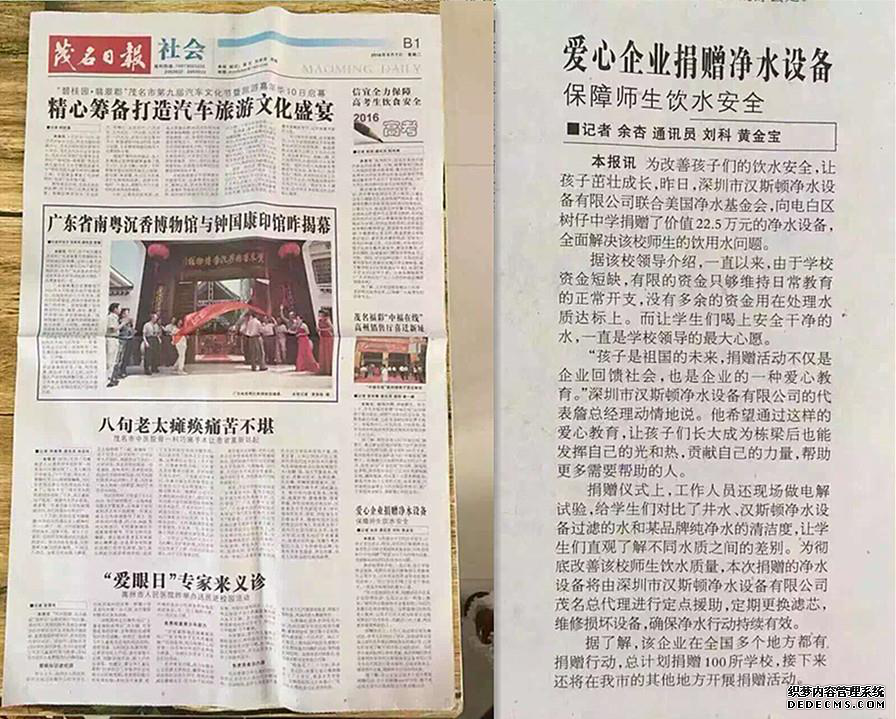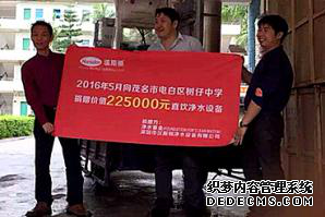 2016年6月6日,漢斯頓凈水器和美國基金會,聯(lián)合發(fā)起的“以愛凈水”公益項目,向茂名市電白區(qū)樹仔中學(xué)捐贈價格22.5萬元的全套凈水設(shè)備正式使用。當(dāng)日,樹仔中學(xué)舉行了熱烈慶典,表達對漢斯頓凈水設(shè)備有限公司及美國基金會獻大愛的感激之情。