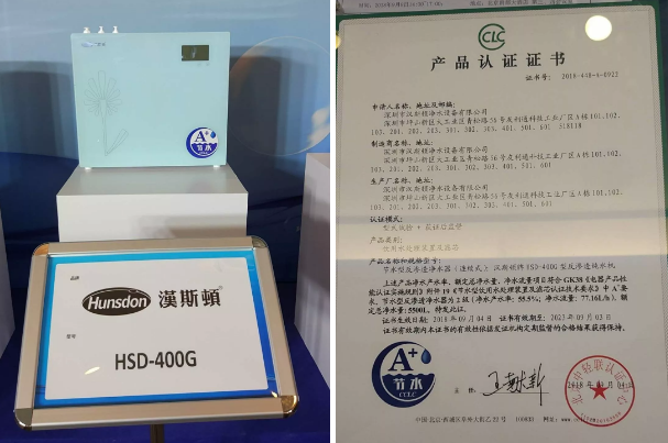發布會上,深圳市漢斯頓凈水設備有限公司凈水器流速王(HSD-400G)獲得了A+節水認證證書。