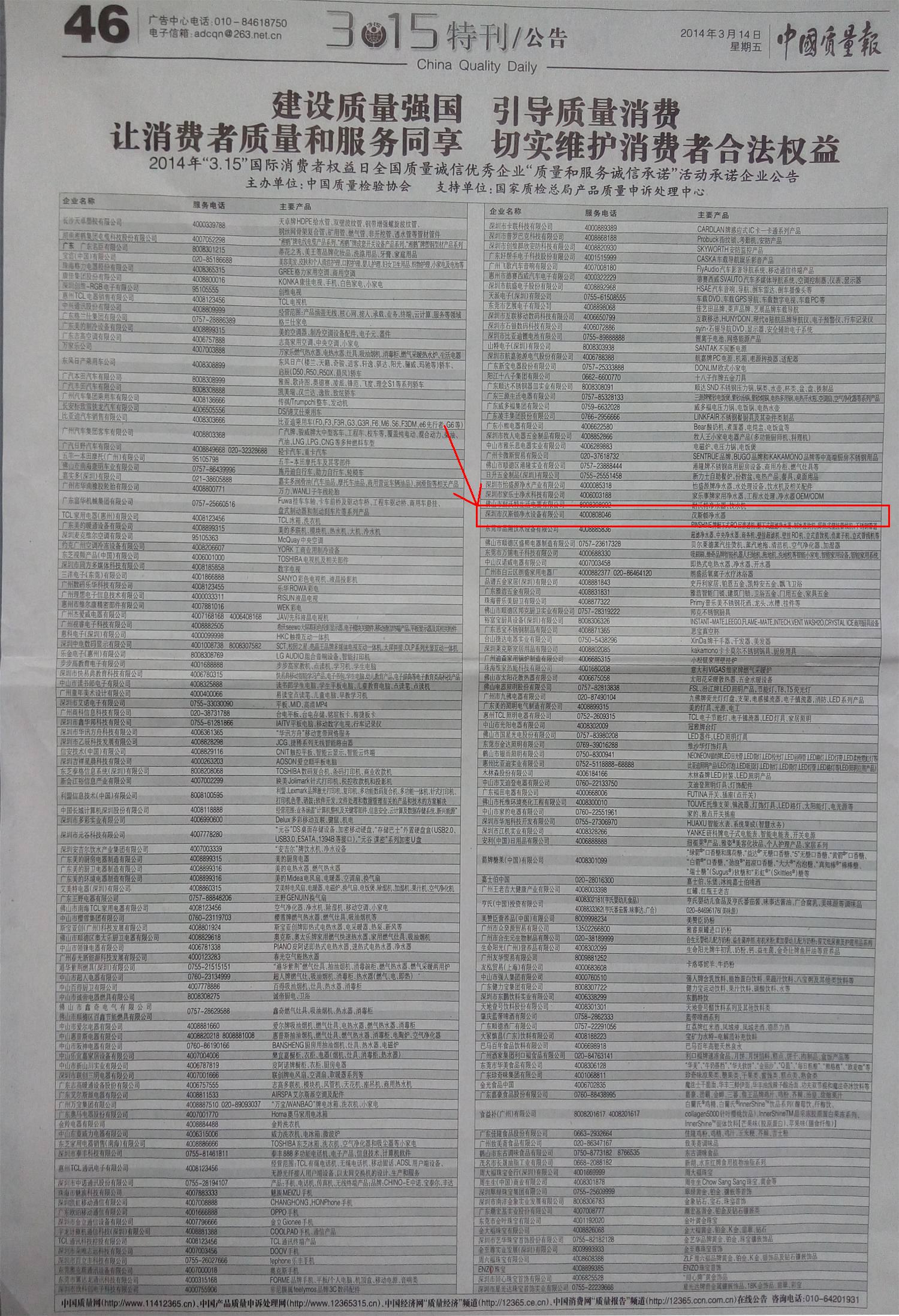《中國(guó)質(zhì)量報(bào)》“3.15特刊”46版參考連接:http://epaper.cqn.com.cn/html/2014-03/14/content_196055.htm#