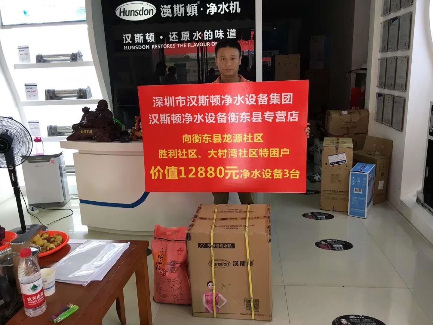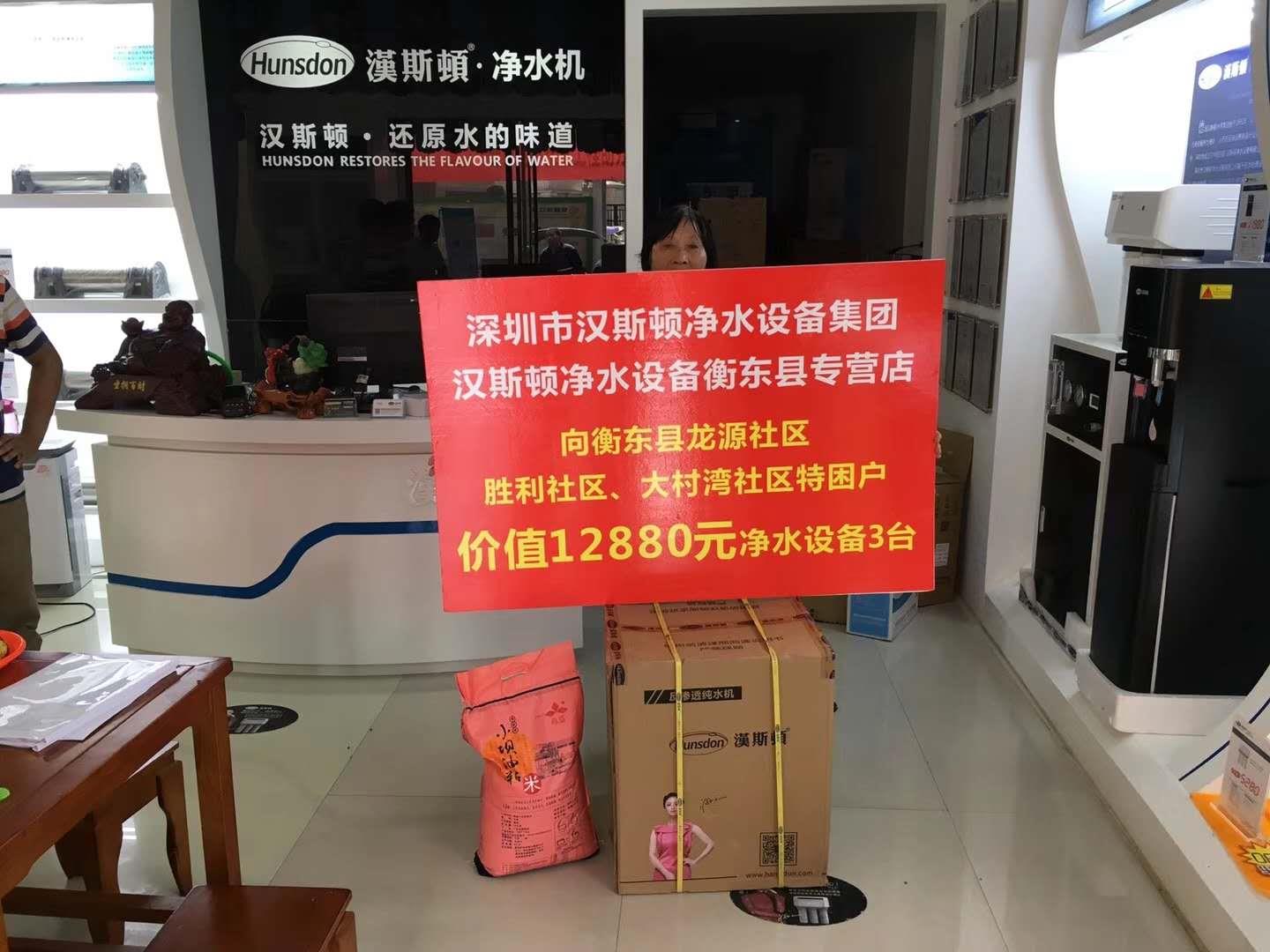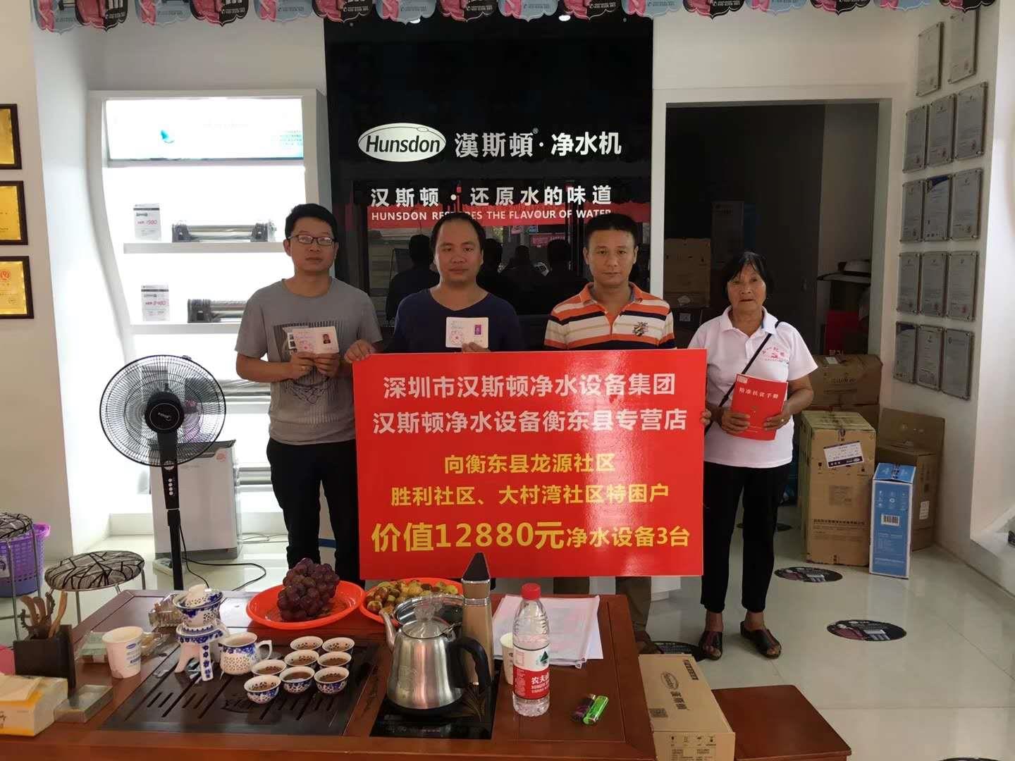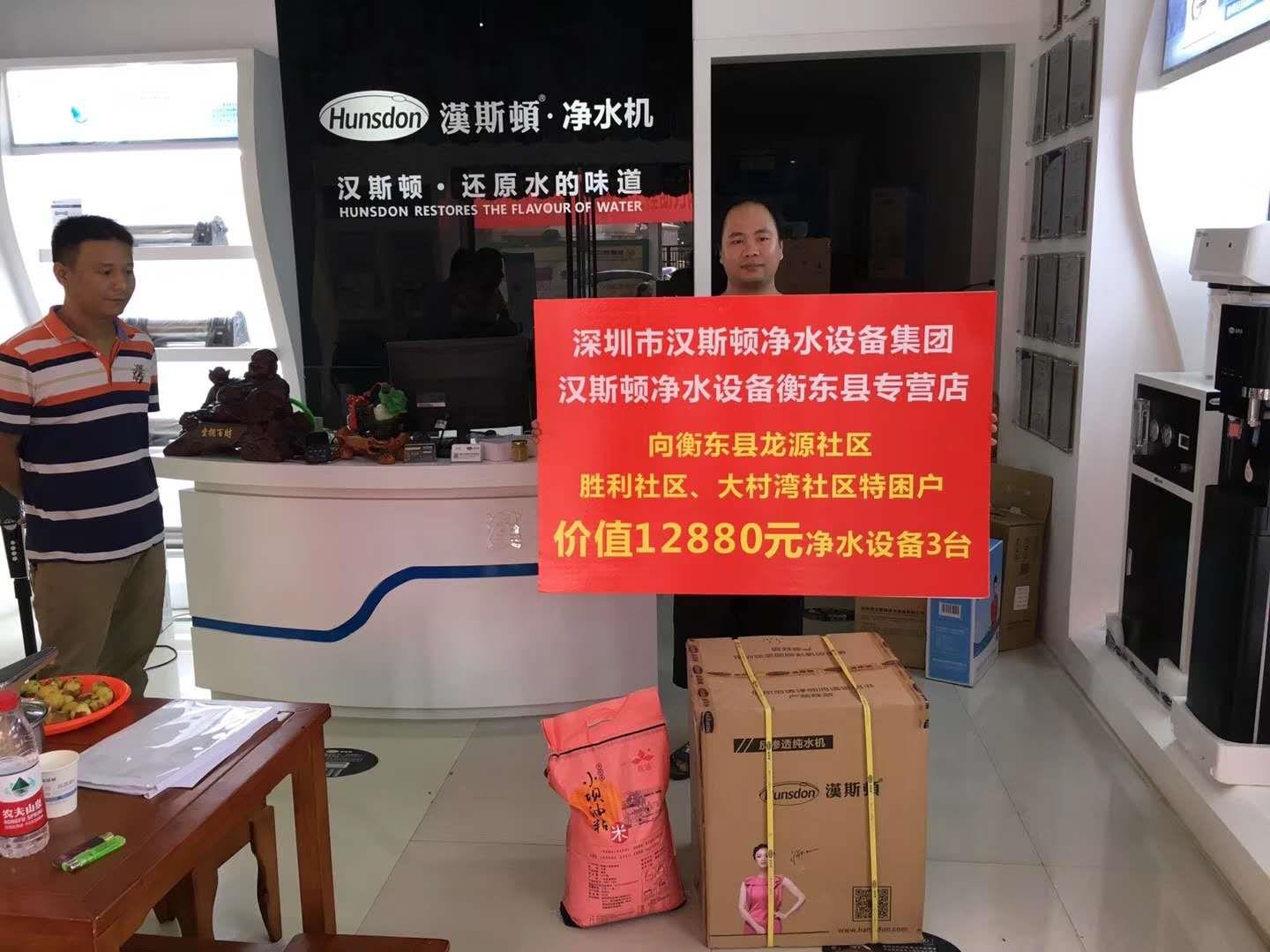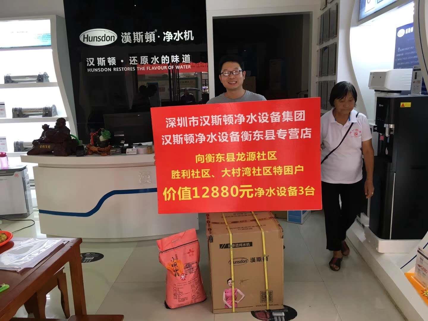 漢斯頓湖南衡東站的工作人員了解到湖南衡東縣龍源、勝利、大村灣社區特困戶人民經濟條件較差,特地捐贈了4臺價值12880元的凈水設備用于解決他們的生活凈水問題。