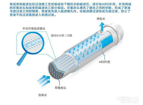 3、中空纖維超濾膜,中空的纖維管上布滿(mǎn)微孔,通過(guò)外壓式或內(nèi)壓式來(lái)濾除水中的大分子物質(zhì),能夠?yàn)V除懸浮物、微粒、膠體、病毒、細(xì)菌等有害物質(zhì),在家用凈水器中一般是作為中間級(jí)的濾芯,更換周期為12至24個(gè)月。