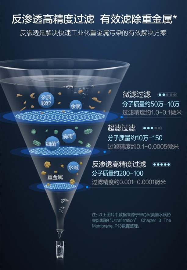 另一類RO反滲透凈水器,如果是真的對(duì)飲水健康有強(qiáng)烈危機(jī)感的用戶,這里我們更建議選擇使用RO反滲透技術(shù)的凈水產(chǎn)品。原因很簡(jiǎn)單,RO反滲透膜最開始是應(yīng)用于醫(yī)學(xué)領(lǐng)域的技術(shù),腎臟透析的高精度沒(méi)有人會(huì)質(zhì)疑,而經(jīng)過(guò)技術(shù)改良應(yīng)用在凈水器中的RO反滲透膜可以實(shí)現(xiàn)目前最高精度過(guò)濾,過(guò)濾出的水是目前最安全的。