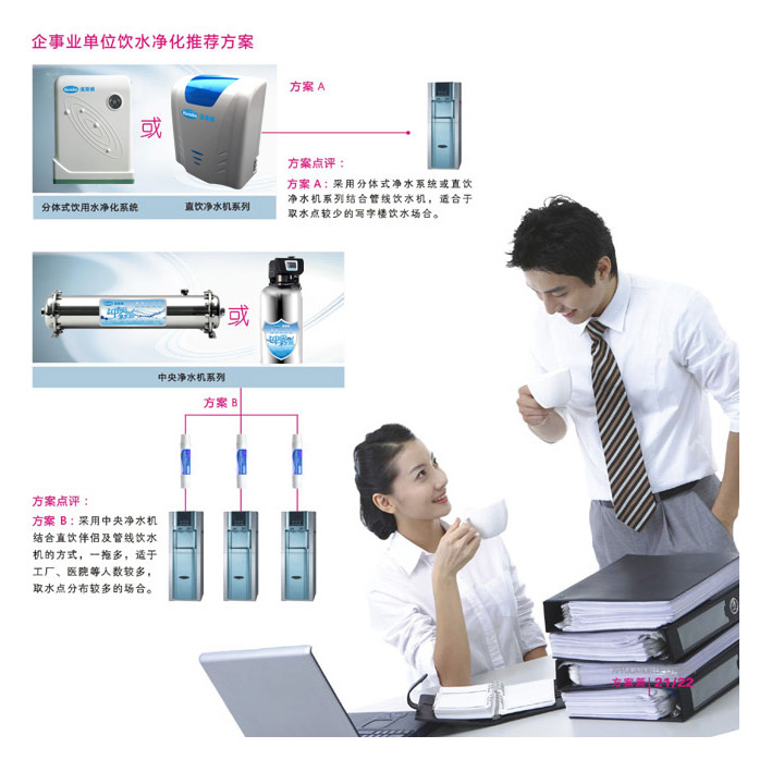 企事業單位飲水的凈化方案,在水質與口感方面,與家庭飲水凈化的需求基本相同,也需要綜合采用超濾凈水技術、活性炭吸附技術、以及水質功能化處理技術等等。在設計單位飲水凈化方案時,還要考慮更多的是安裝時飲水點布置的合理性和取水的方便性。因此,單位飲水末端取水裝置均推薦采用管線飲水機。